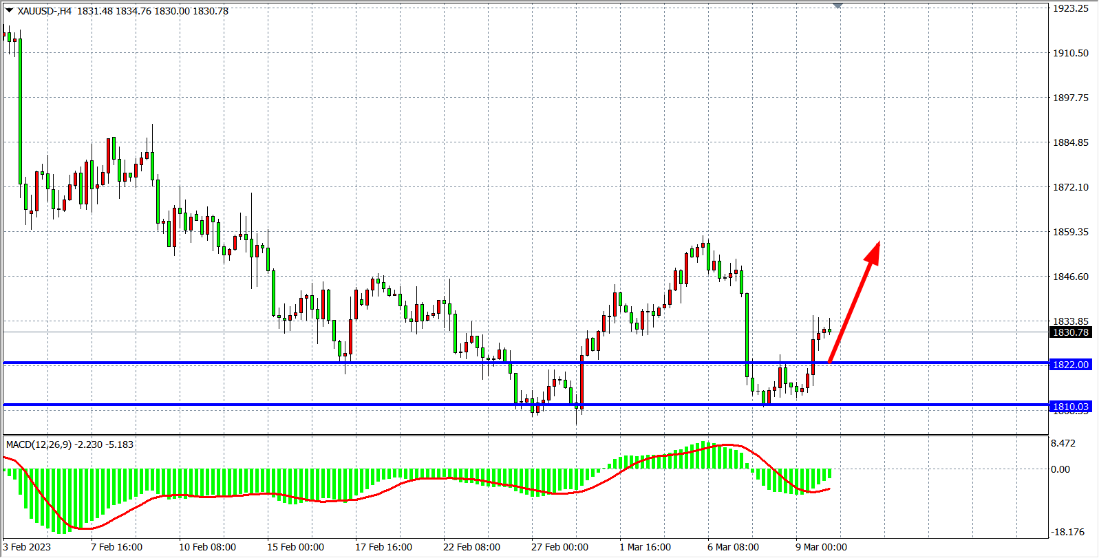 4小时图看,金价在1810一线企稳后开启反弹,重返1830关口之上,MACD在零轴之下缩量即将上穿零轴,行情有望延续反弹,日内关注1822支撑,在该位之上看涨1845-1860。