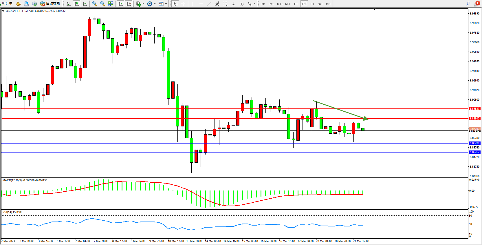 美元人民币USDCNH——4小时K线图显示: