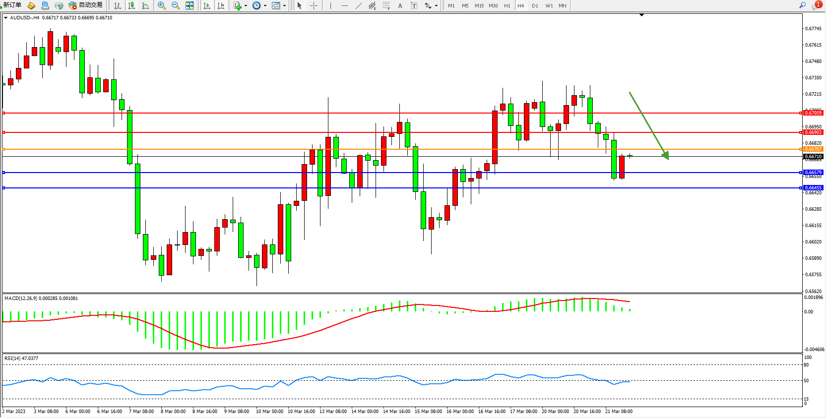交易策略:0.66767下方看跌,目标0.66579  0.66455