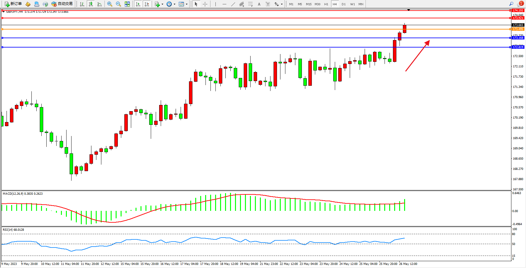 交易策略:173.495上方看涨,目标173.921 174.193
