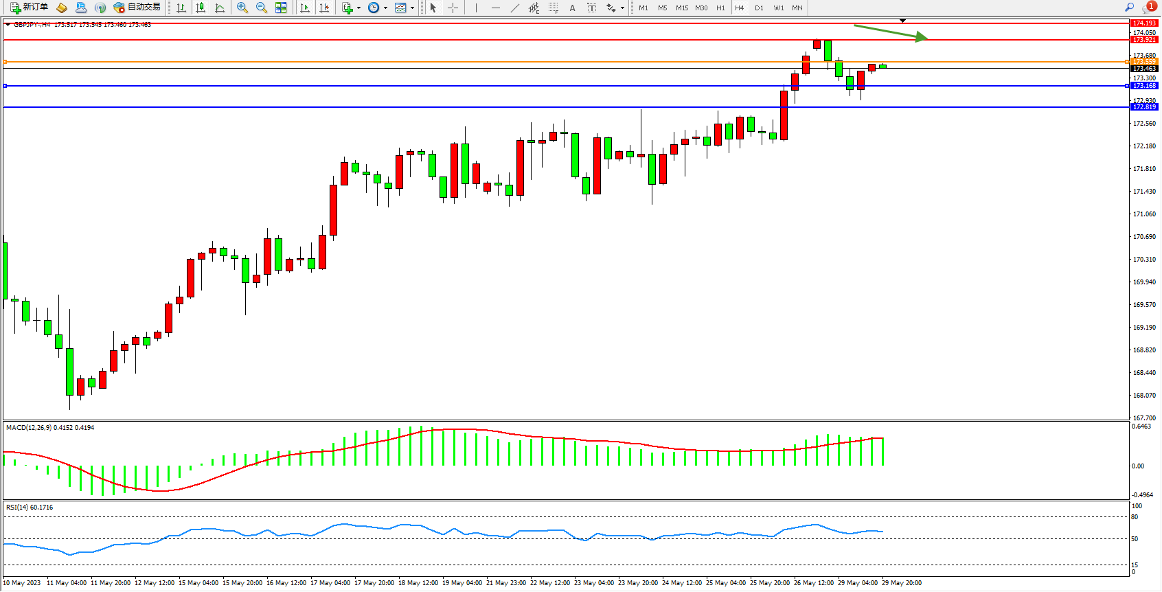 交易策略:173.463下方看跌,目标173.168 172.819