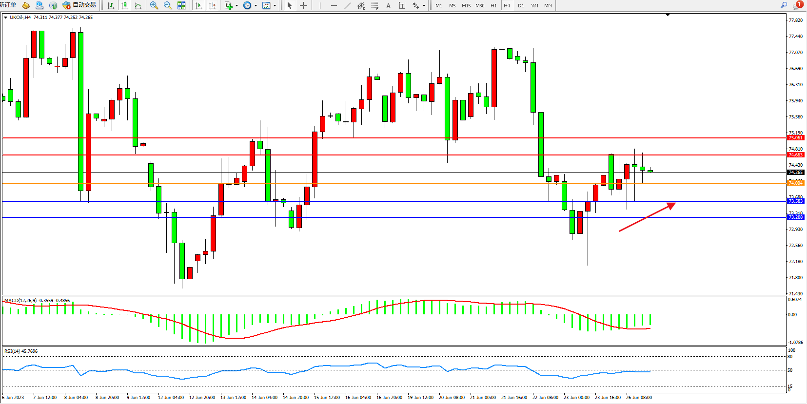 交易策略:74.004上方看涨,目标74.663 75.061