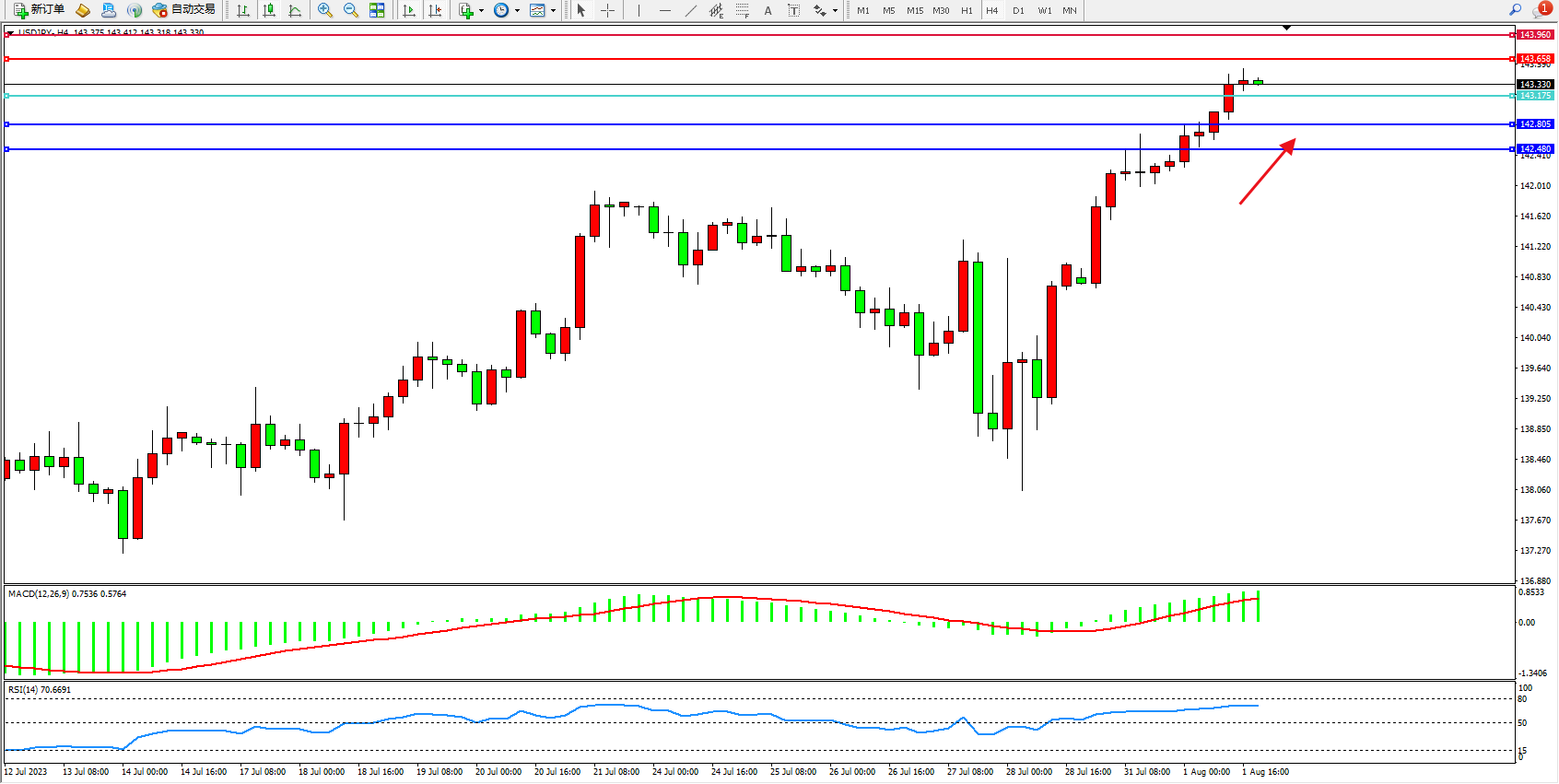 交易策略:143.175上方看涨,目标143.658 143.960