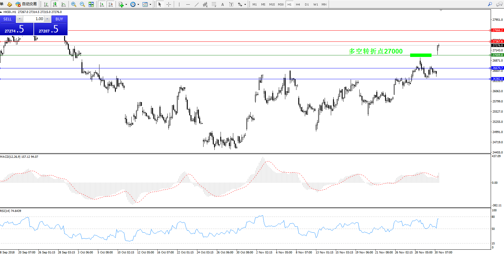 交易策略:在27000上方看多,目标27367--27666