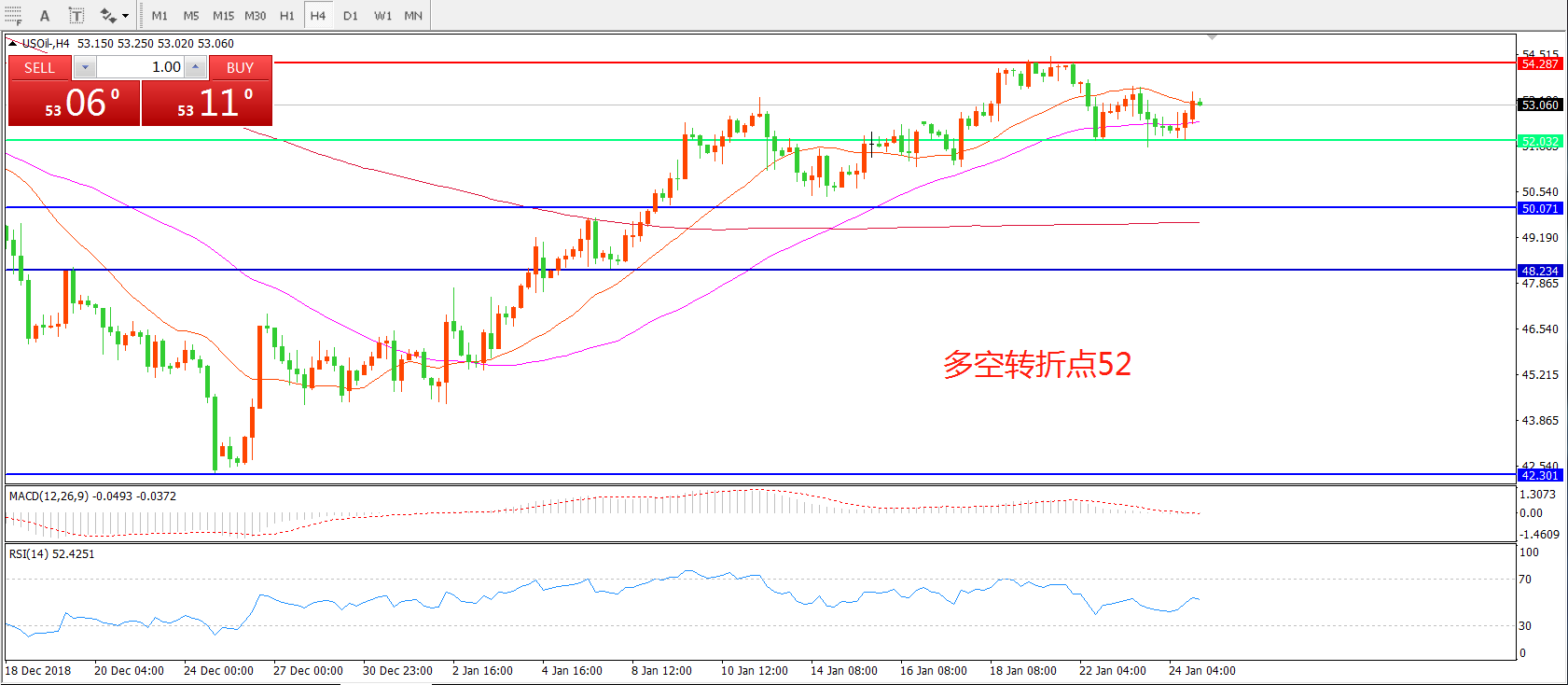 4小时图看,油价经过连续整理站稳52美元,短期整理后受制于54美元关口, 均线系统呈多头排列, MACD红柱增加,重点关注上方阻力。