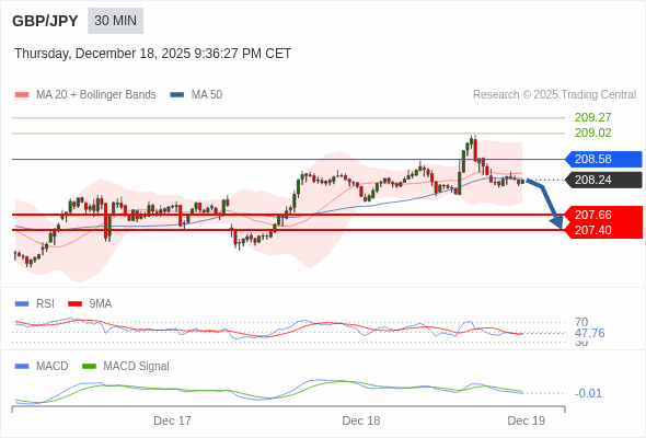 英镑/日元 当日内 : 看跌,在 208.58 之下。