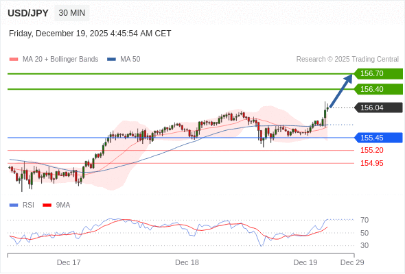 在 155.45 之上,看涨,目标价位为 156.40 ,然后为 156.70 。