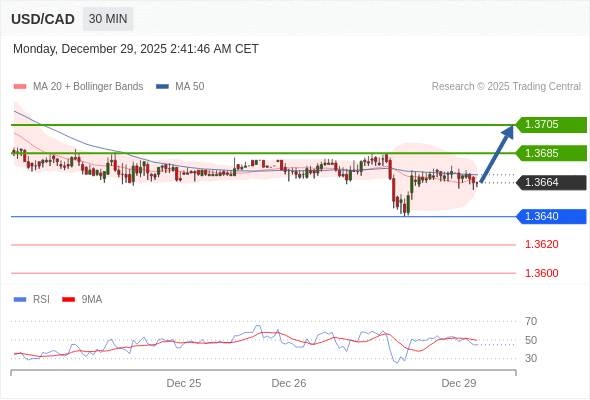 在 1.3640 之上,看涨,目标价位为 1.3685 ,然后为 1.3705 。