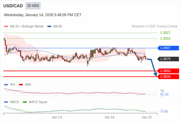美元/加元 当日内 : 看跌,在 1.3897 之下。