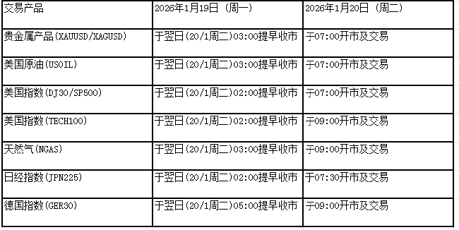 因应美国马丁路德金纪念日假期2026年1月19日(周一), 本公司以下产品的交易时间将于假期期间作以下安排,敬请留意。