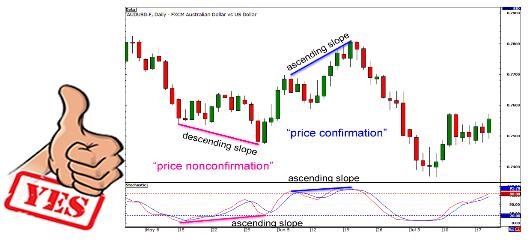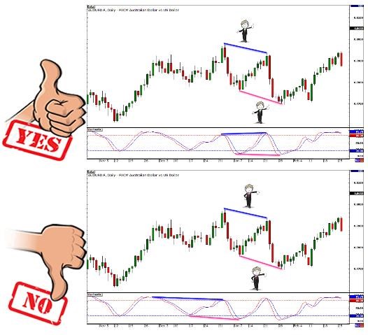 如果你画出一条连接两个高点的直线,你必须同时画出连接指标两个高点的直线。这一做法也同样适用于低点时的情况。如果你画出一条连接两个低点的直线,你也必须同时画出连接指标两个低点的直线。