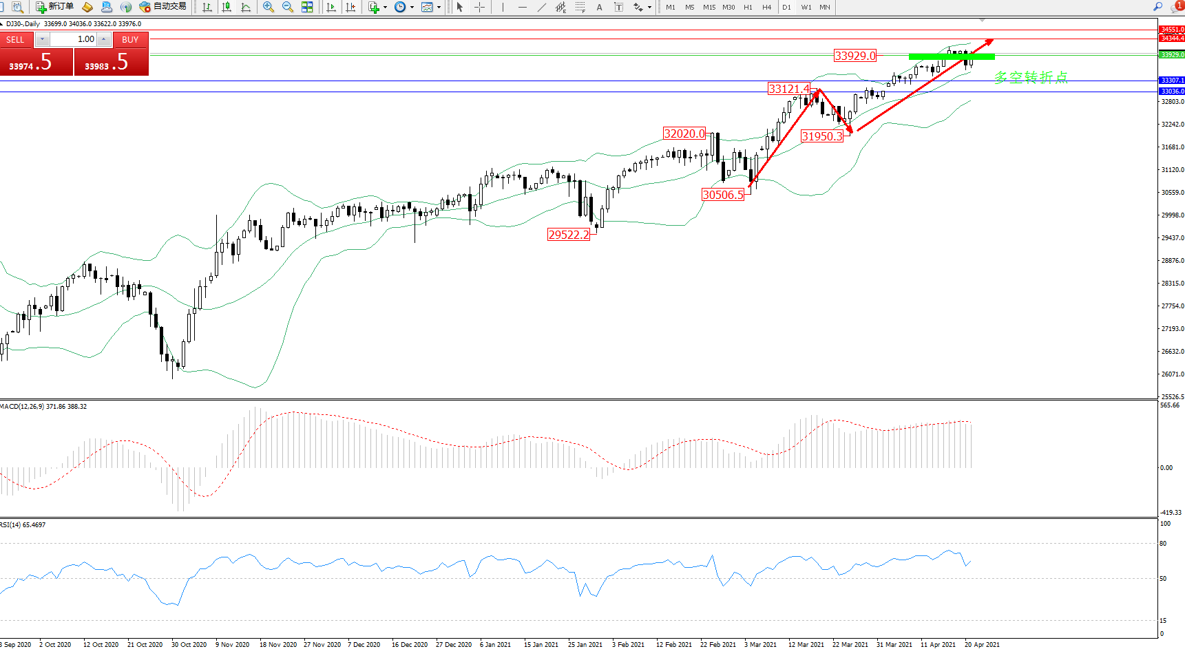 交易策略:33929上方看涨,目标34344、34551
