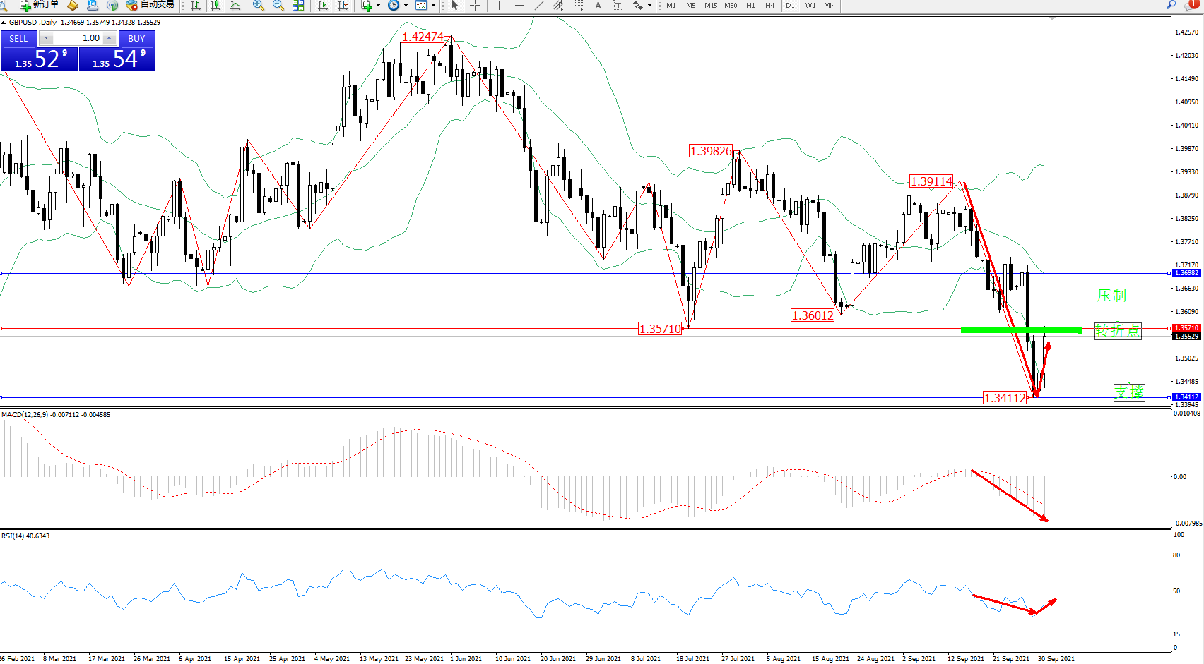 高位空头动力延续布林带指标通道中下轨区间持续震荡下行,低位抵达1.34112位置后得到支撑强势反转拉升,多头动力伺机入场,布林带指标呈张口走势后有短暂收口迹象,上方压制关注1.36982附近,低位支撑关注1.34112附近,关注1.35710附近转折点,MACD指标处于空头区域持续震荡下行,RSI指标处于空头区域持续震荡下行后开始缓慢回升,如图: