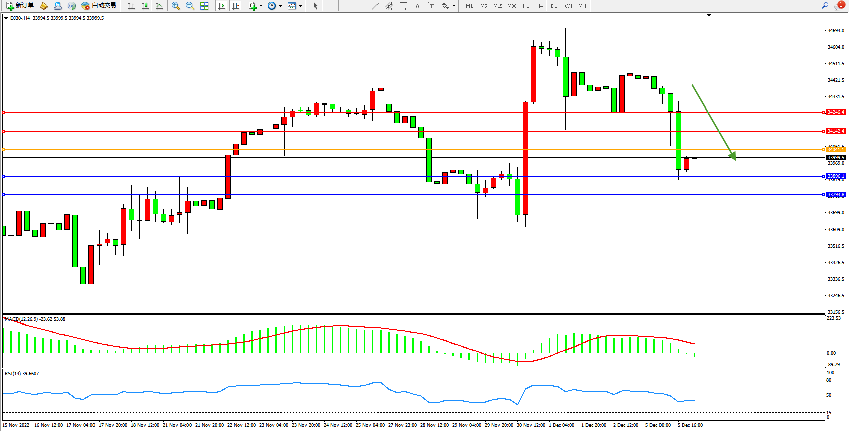 道琼斯指数DJ30——4小时K线图显示: